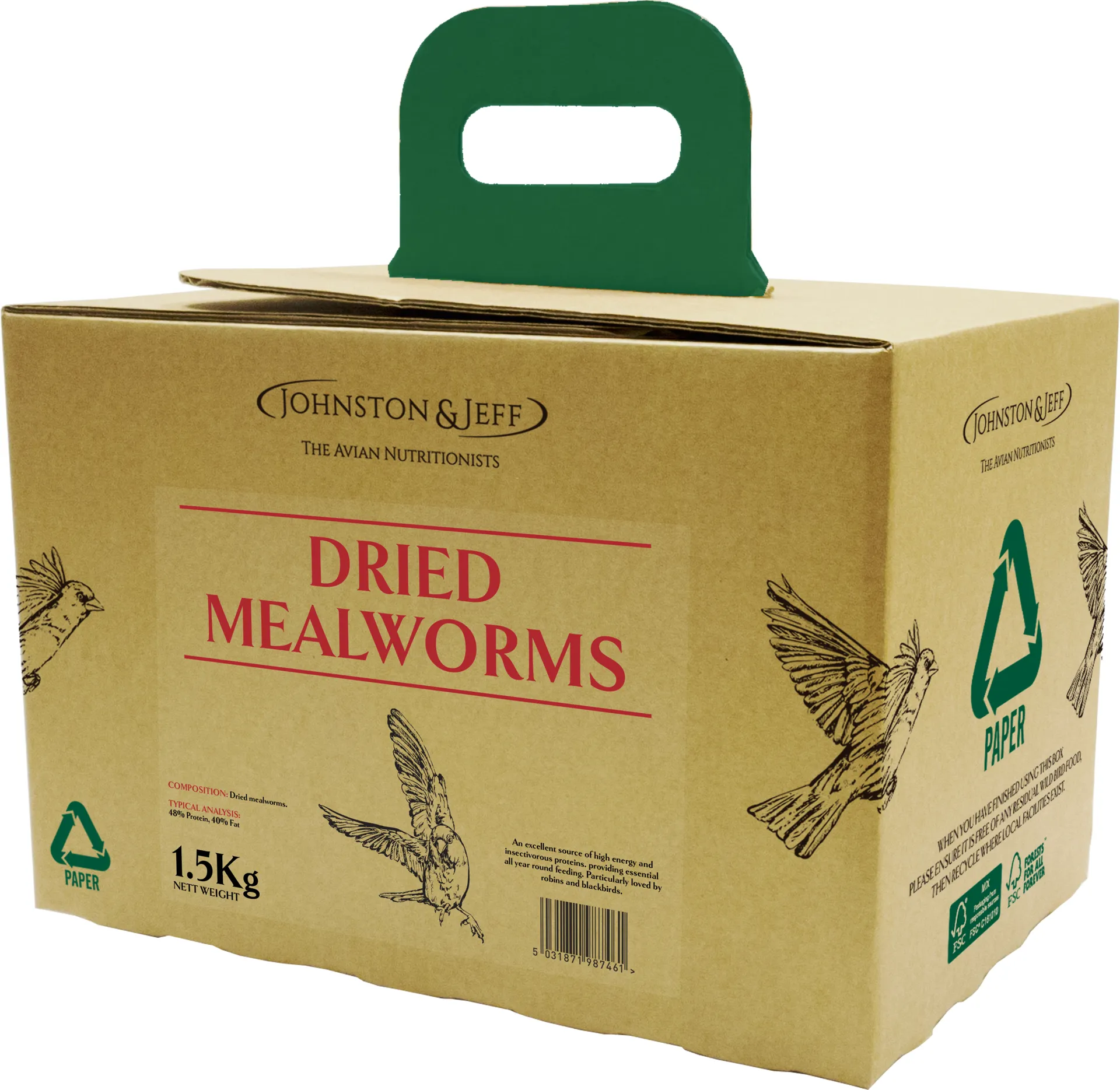 Johnston & Jeff Mealworms, are dried to retain goodness. High in protein they are a tasty treat for a variety of wild birds including Robins, Blackbirds and Thrushes.