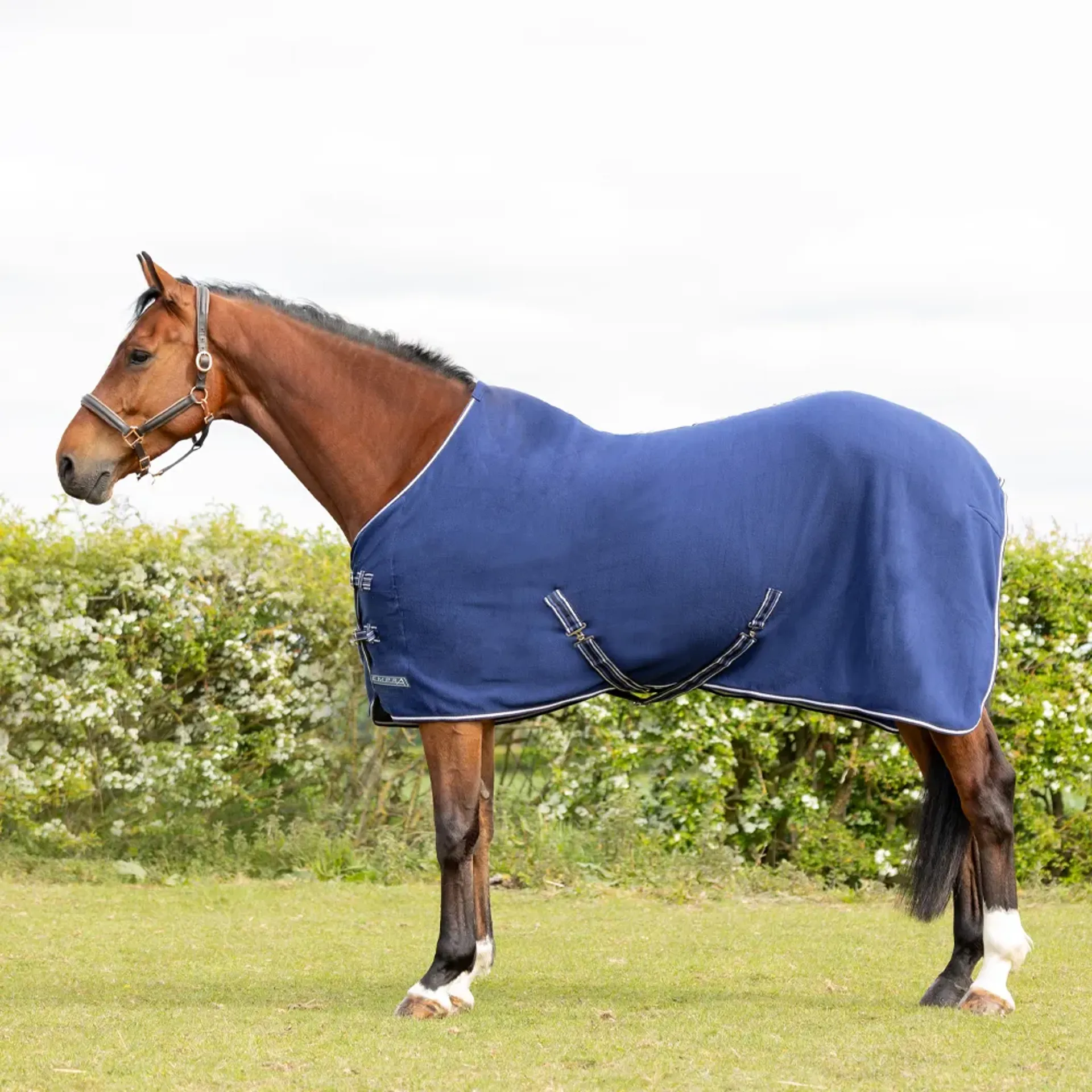 A smart addition to any horses wardrobe. Ideal for use whilst travelling, after bathing or exercise, or under another rug for added warmth. Made from soft fleece fabric which traps the air to help insulate your horse keeping them warm and comfortable. The fabric also wicks moisture away from the skin making it ideal to be put on a damp horse to prevent them from catching a chill. Featuring a fleece lined wither for extra comfort and is fastened with twin buckle chest fastenings, adjustable cross surcingle's and fillet string for a secure fit
